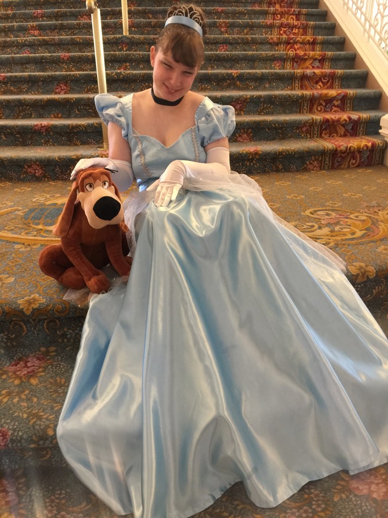 For my birthday present in 2019, my brother and sister-in-law told me I would get a Cinderella makeover at Disney World. I told my Mom this would make a great photo if I could bring my plush dog Bruno which is Cinderella’s dog that I had just gotten for Christmas.