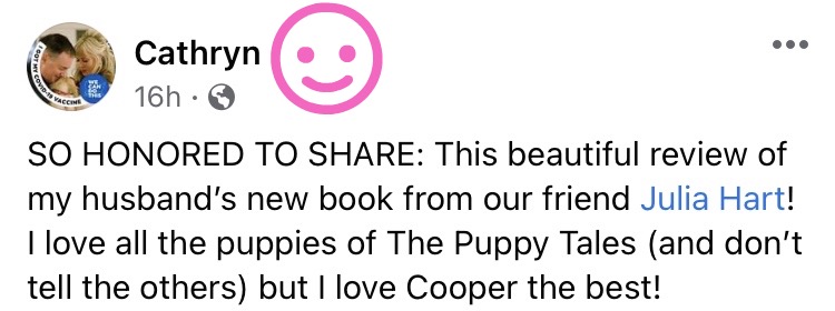 Now you’re probably wondering, “So what is this big surprise you woke up to?” Well, yesterday I put my review on “Cooper’s Story” online on Goodreads and Facebook. And then this morning, I woke up to see that I had been tagged on FaceBook by Bruce’s wife, Cathryn! When I clicked on it, I was excited to see she had not only shared my review, but had given me a shoutout and called me their friend!